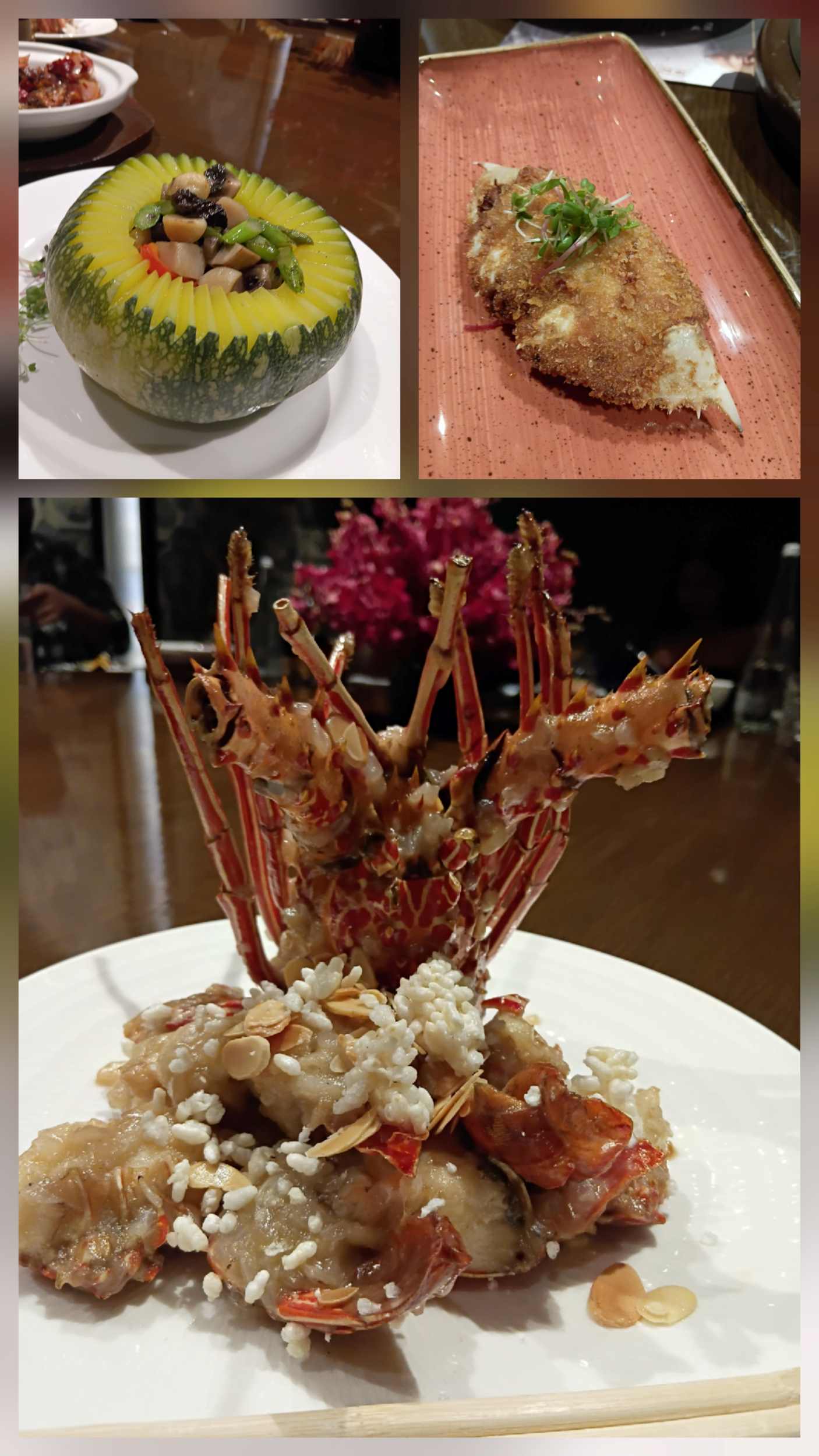 The lobster, tossed with almond flakes in a superior broth, was another highlight and indulgent without being heavy. Even the stir-fried vegetables, served in a pumpkin with macadamia nuts, held their own, offering texture and warmth that felt deeply satisfying. By the time dessert arrived — a smooth avocado cream paired with dark chocolate, the meal had settled into a rhythm that felt both luxurious and hearty.